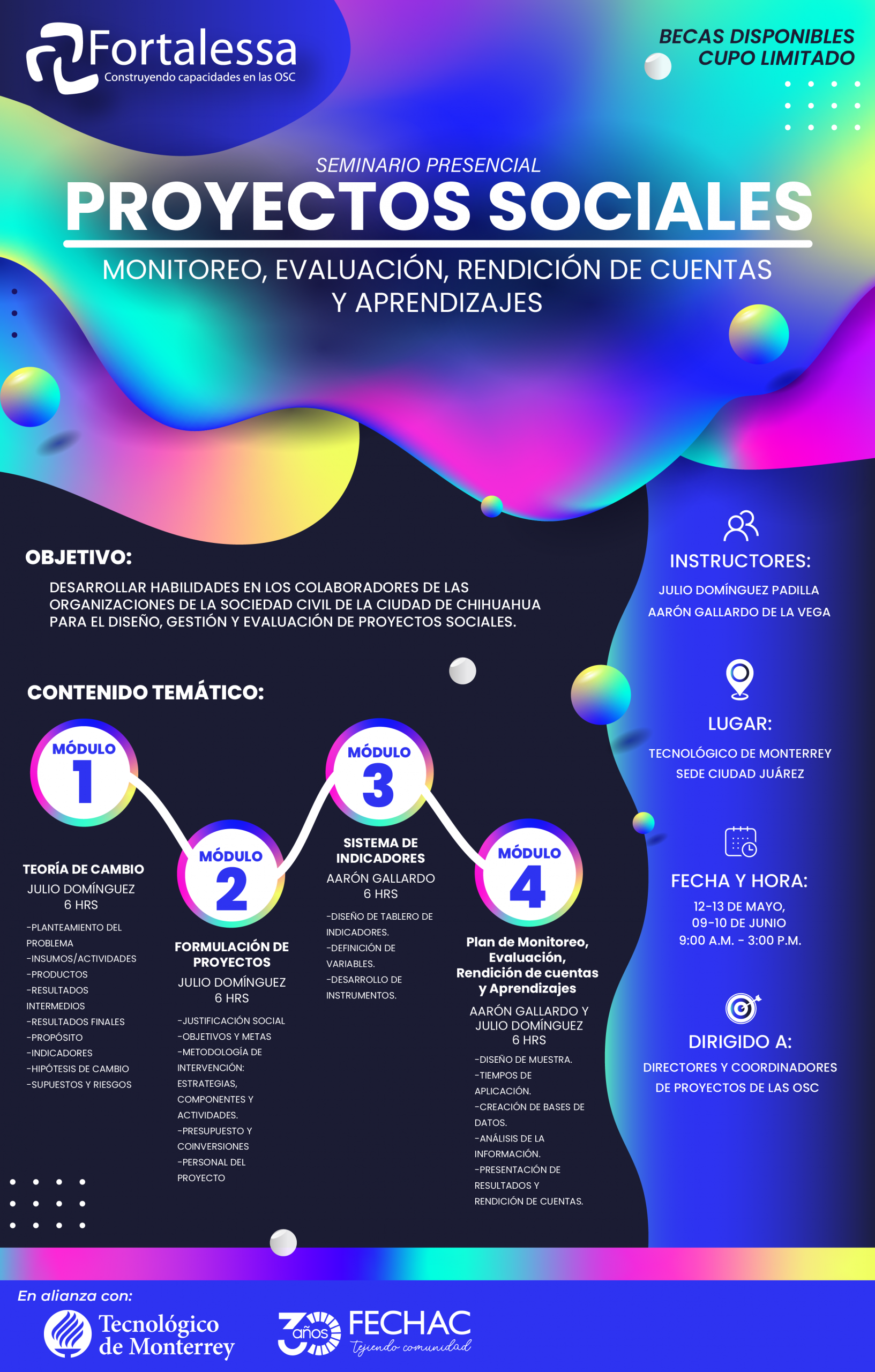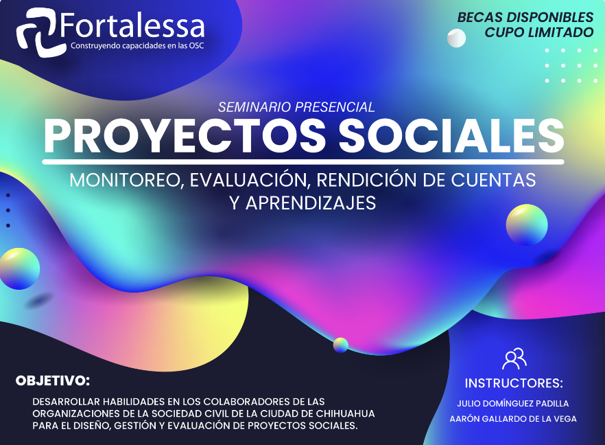 - Registrarse en nuestro sitio para formar parte del Seminario “PROYECTOS SOCIALES: Monitoreo, Evaluación, Rendición de Cuentas y Aprendizajes” (disponible en www.fortalessa.org.mx en la sección de cursos) y llenar los campos con la información del participante. El link para acceder al registro también podrá ser solicitado a los siguientes correos: contacto@fortalessa.org.mx o drascon@fortalessa.org.mx