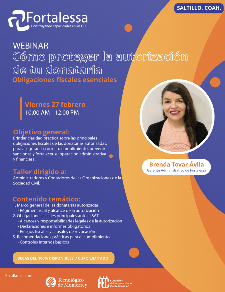 - Registrarse en nuestro sitio para formar parte del Webinar “OSC Donatarias Autorizadas: Ventajas, Obligaciones y Requisitos” (disponible en www.fortalessa.org.mx en la sección de cursos) y llenar los campos con la información del participante. El link para acceder al registro también podrá ser solicitado a los siguientes correos: contacto. saltillo@fortalessa.org.mx; tarreazola@fortalessa.org.mx o jescobedo@fortalessa.org.mx