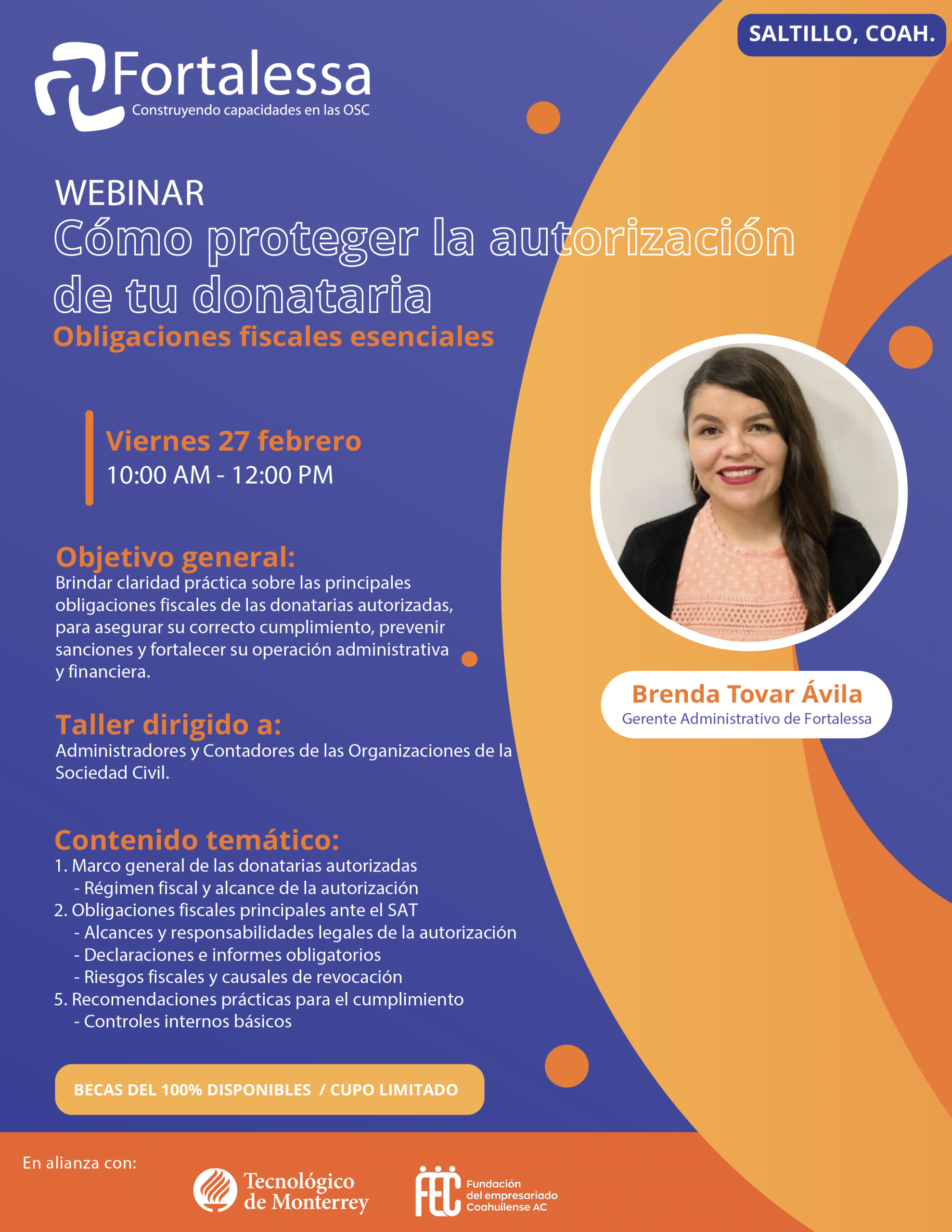 Gracias al apoyo de FEC, Tecnológico de Monterrey y Fortalessa, se otorgarán becas del 100% para los integrantes de organizaciones sin fines de lucro.