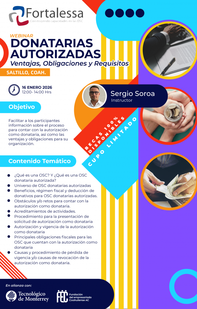 organización de la sociedad civil legalmente constituida. - Registrarse en nuestro sitio para formar parte del Webinar “OSC Donatarias