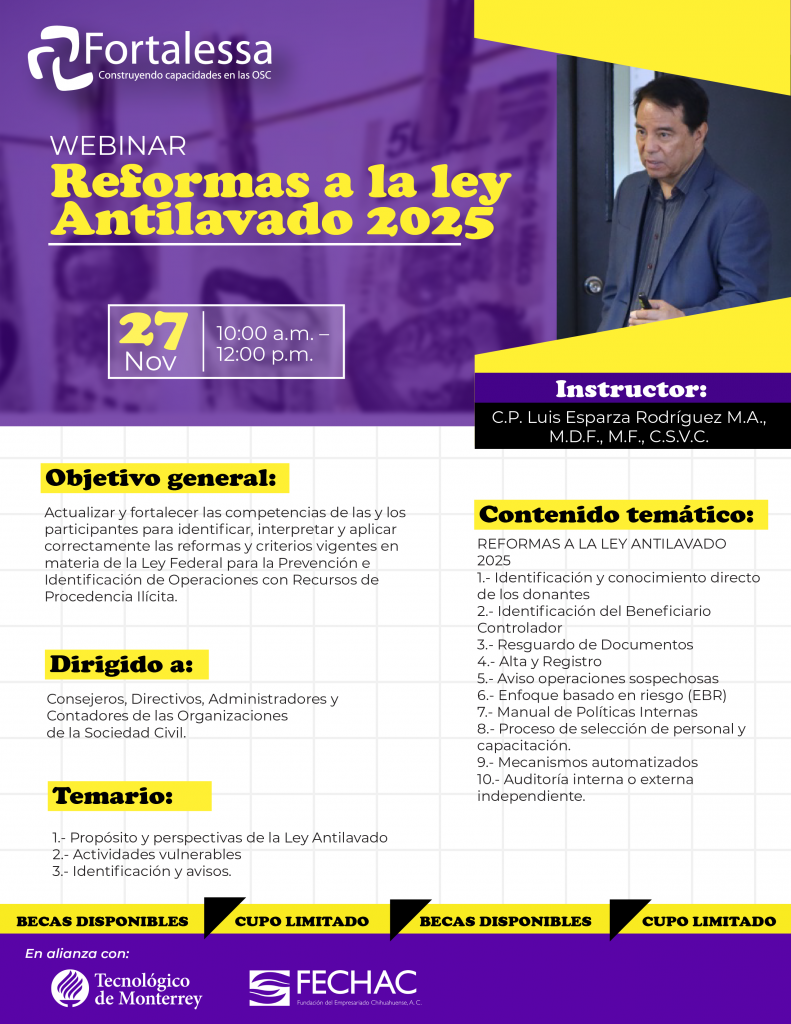 - Registrarse en nuestro sitio para formar parte del Webinar “REFORMAS A LA LEY ANTILAVADO 2025 para Organizaciones sin Fines de Lucro” (disponible en www.fortalessa.org.mx en la sección de cursos) y llenar los campos con la información del participante. El enlace para acceder al registro también podrá ser solicitado a los siguientes correos: contacto@fortalessa.org.mx o